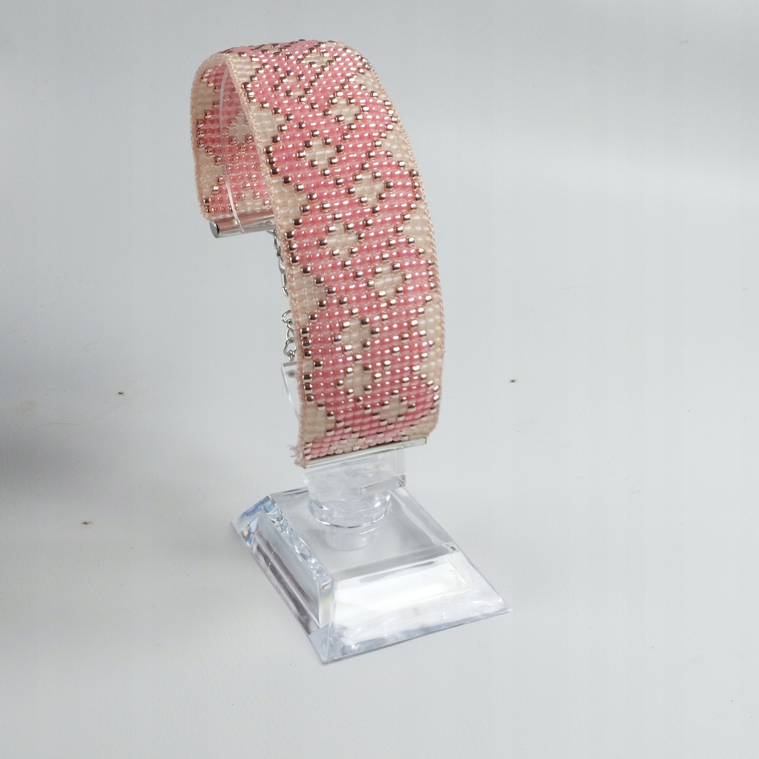 - Materiały: Japońskie koraliki Toho/Miyuki w odcieniach różu i ecru, zapięcie wsuwane ze stali chirurgicznej.