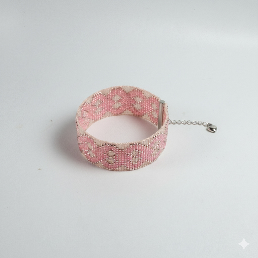 Opis: Godziny precyzyjnej pracy, setki drobnych koralików i pasja inspirowana kunsztem wielkich mistrzów. Ta szeroka bransoleta to hołd dla rzemiosła i delikatności. Jej pudrowo-różowy wzór, przeplatany blaskiem różowego złota, przypomina płatki kwiatów z Twojego ogrodu o poranku. To biżuteria, która jest nie tylko ozdobą, ale cichym szeptem o pięknie, cierpliwości i miłości do tworzenia.