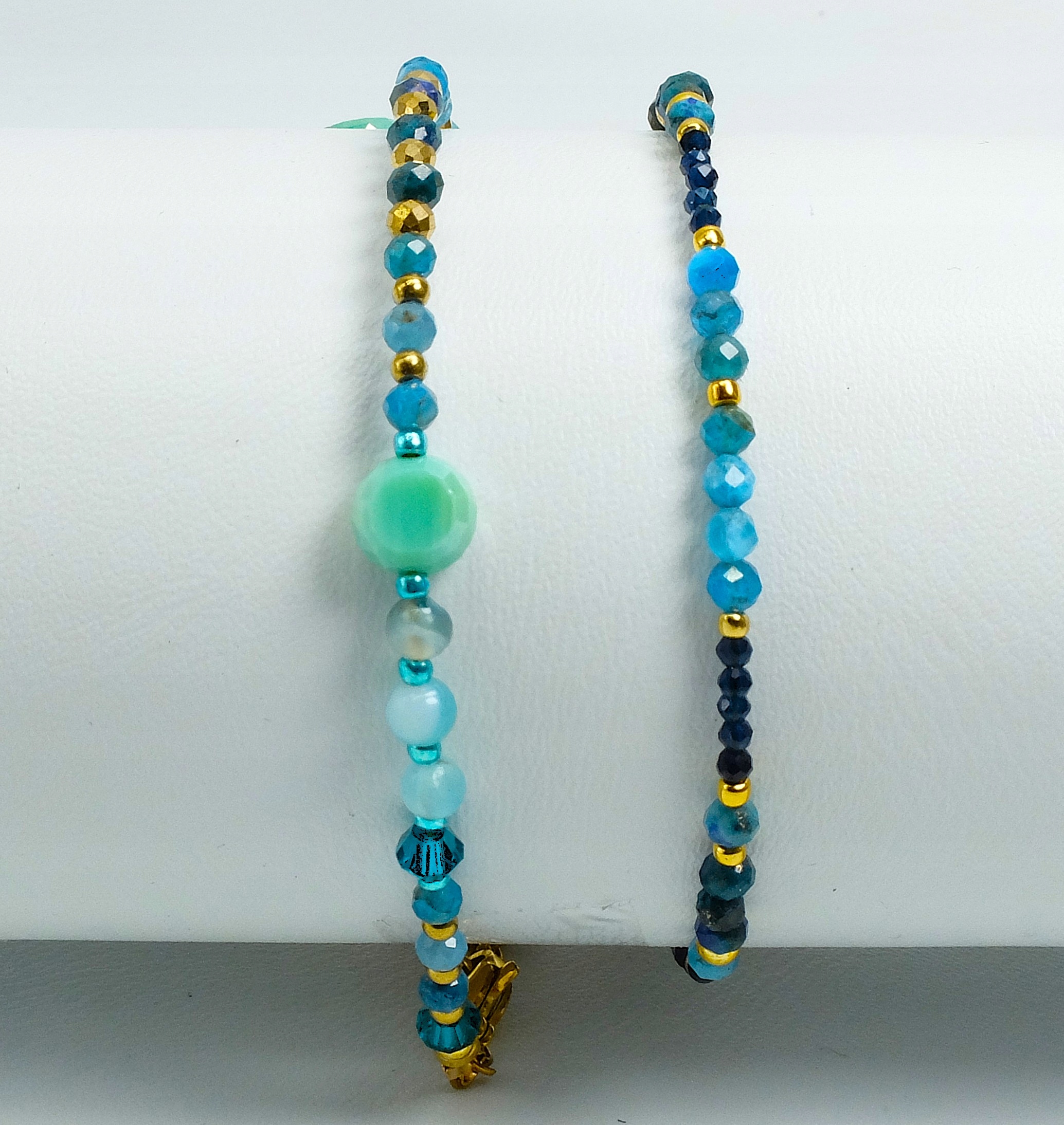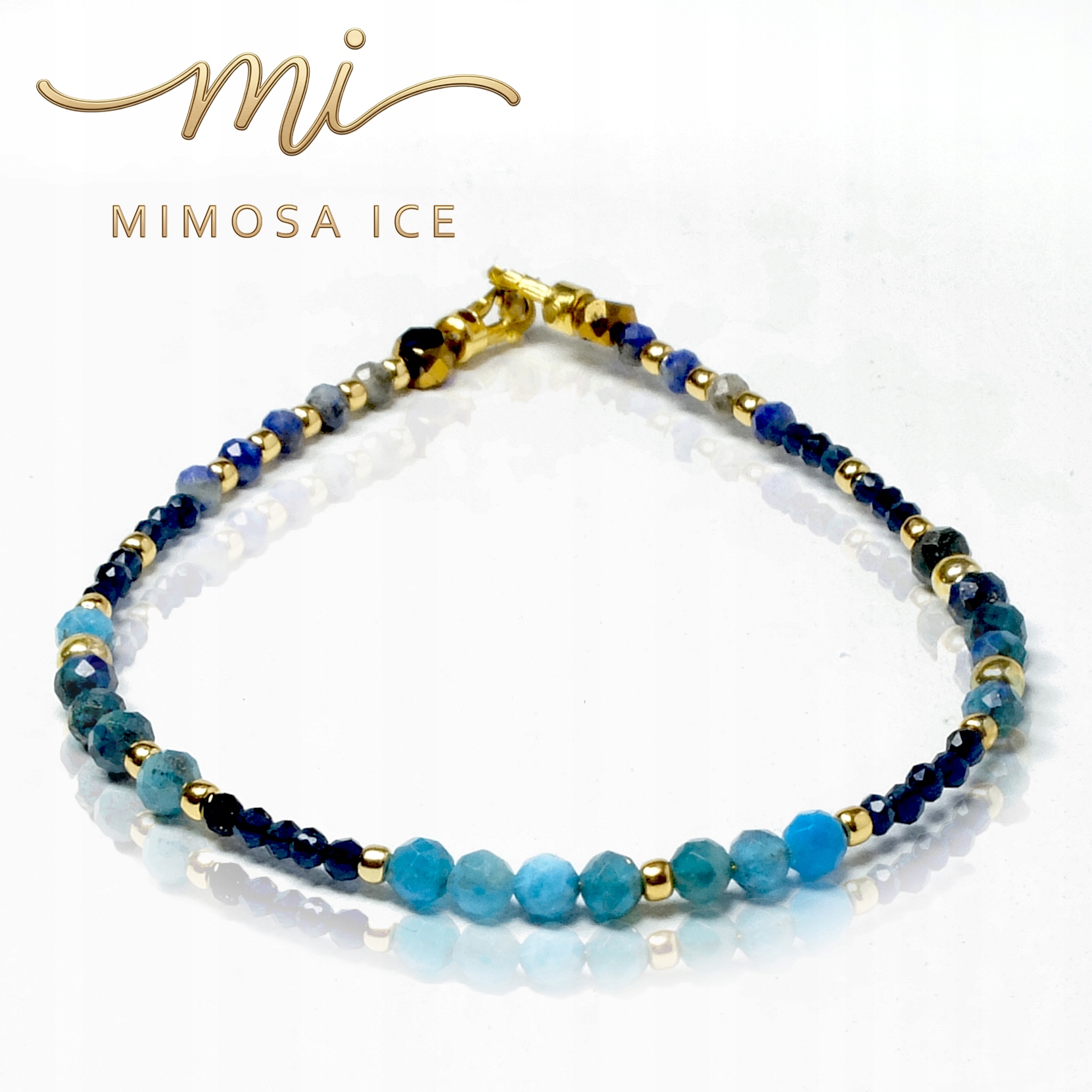 - Materiały: Fasetowane kamienie naturalne (Apatyt, Sodalit), hematyt w kolorze złota.