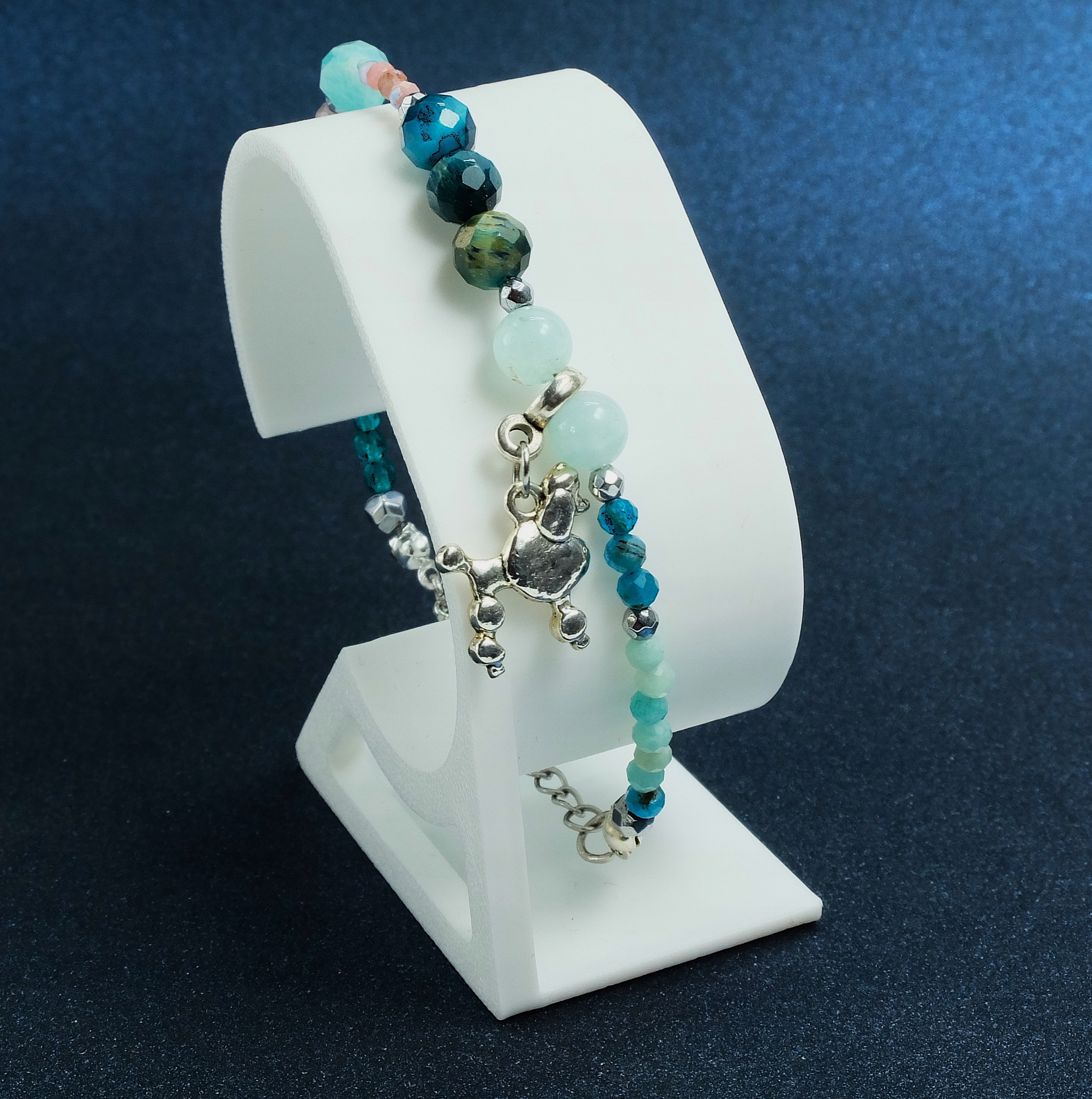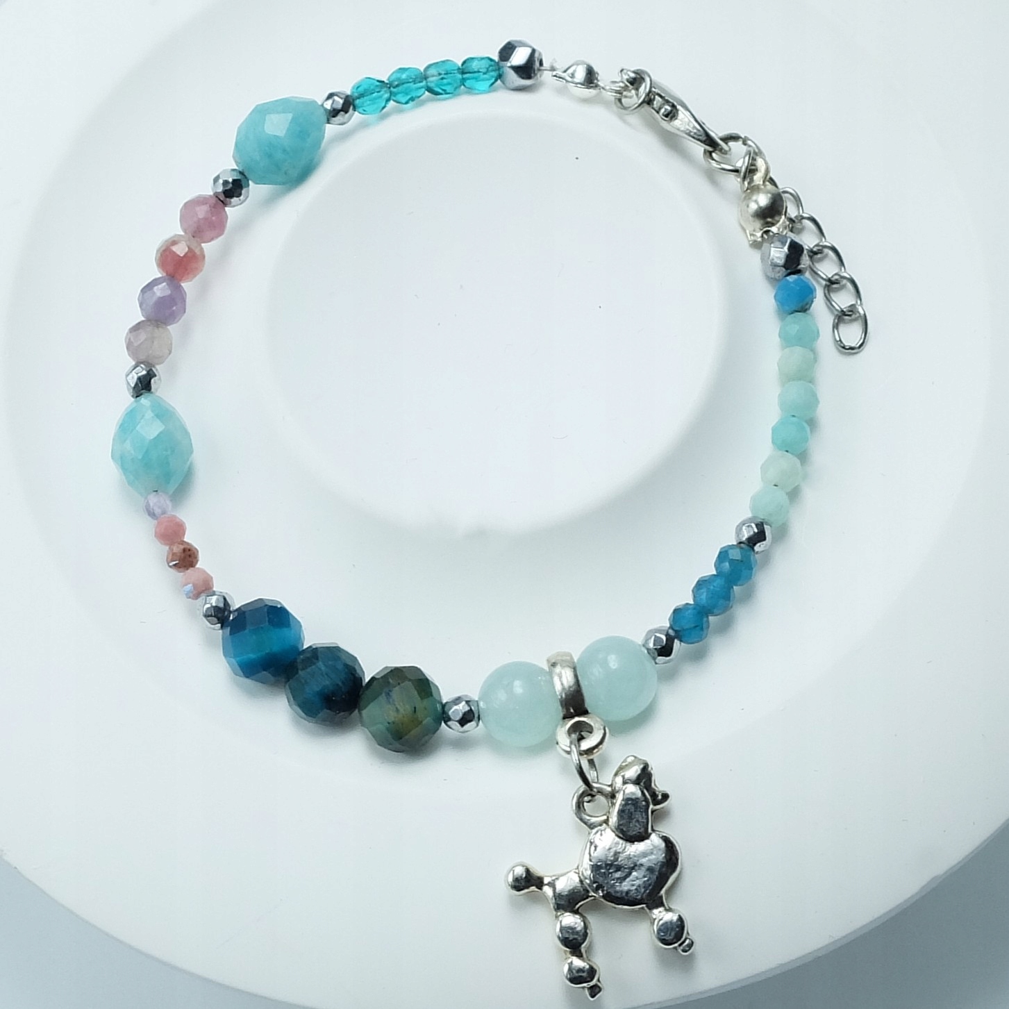 - Detale: Fasetowane kamienie naturalne (Apatyt, hematyt, oko tygrysa, rodonit, angelit, turmalin), elementy, zapięcie z łańcuszkiem regulacyjnym.