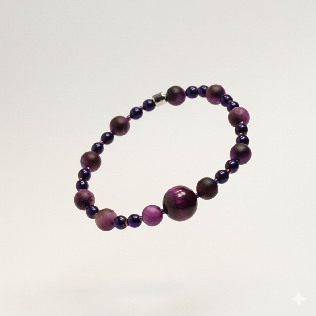 Bransoletka JAGODOWY SZLAK to esencja głębokiego koloru i tajemniczego blasku. Stworzona z naturalnego Fioletowego Tygrysiego Oka o hipnotyzującym, migoczącym efekcie oraz lśniących, drobnych koralików hematytowych, które nadają całości nowoczesnego charakteru. Idealna dla osób ceniących sobie oryginalną biżuterię z duszą i mocą kamieni.