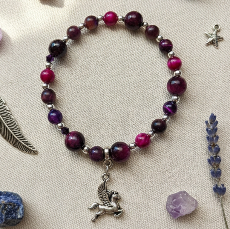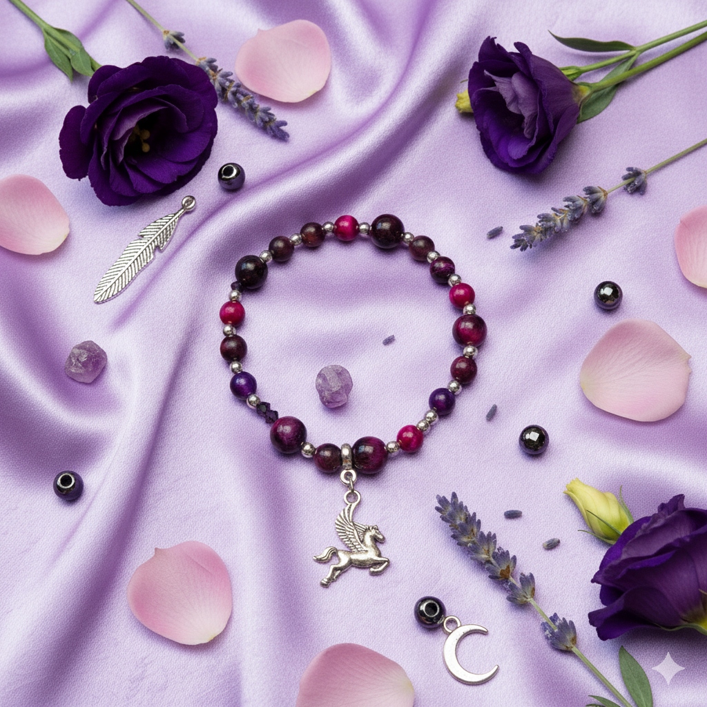 Bransoletka to esencja głębokiego koloru i tajemniczego blasku. Stworzona z naturalnego Fioletowego Tygrysiego Oka o hipnotyzującym, migoczącym efekcie oraz lśniących, drobnych koralików hematytowych, które nadają całości nowoczesnego charakteru. Idealna dla osób ceniących sobie oryginalną biżuterię z duszą i mocą kamieni.
