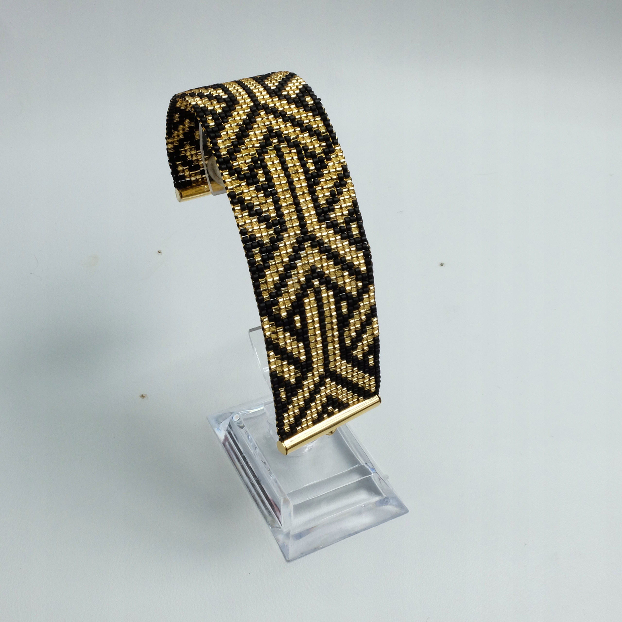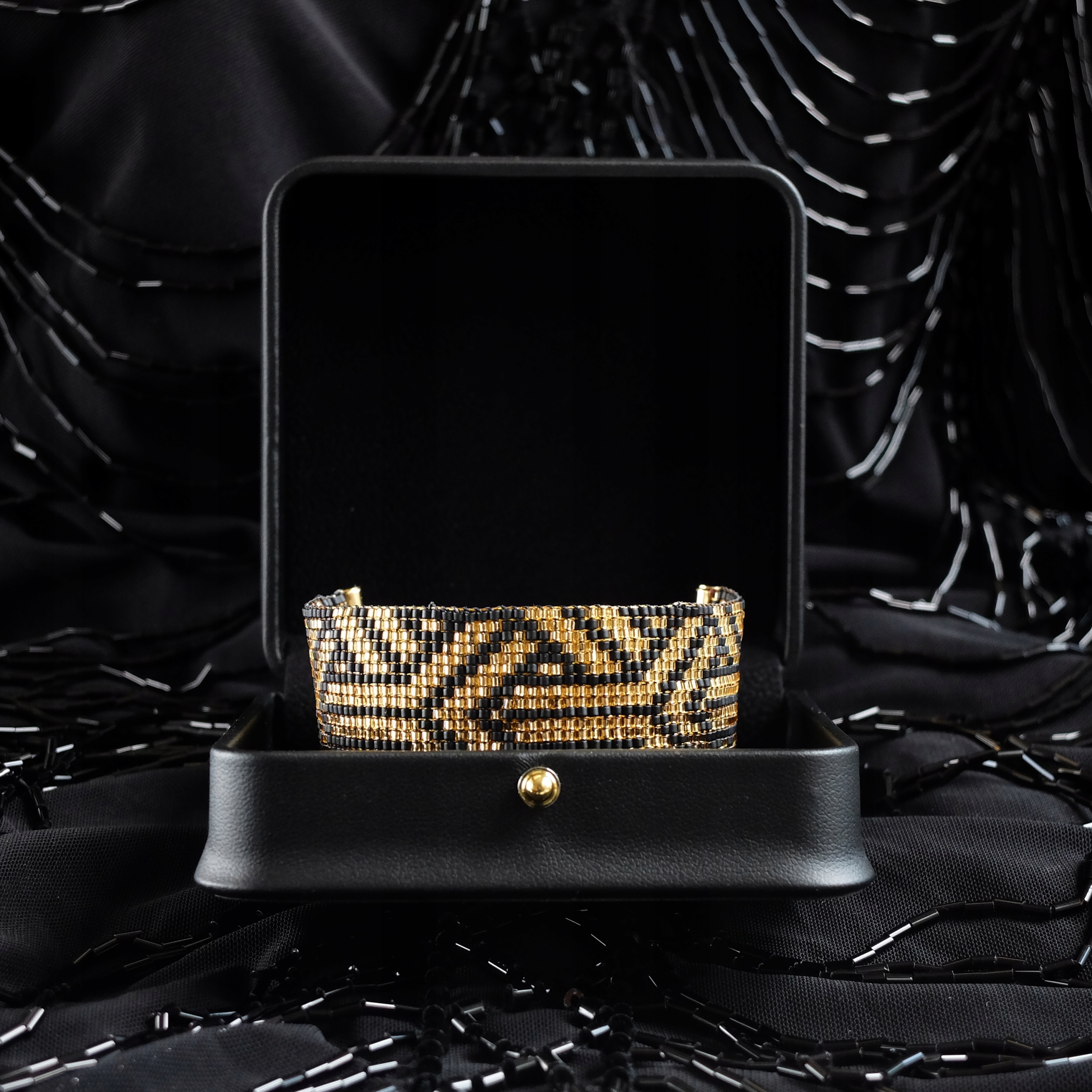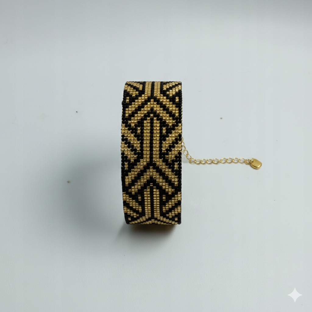 Są dzieła, które rodzą się z podziwu dla mistrzostwa. Ta bransoleta to hołd dla tysięcy godzin pracy anonimowych artystów, których kunszt podziwiałam jako dziecko. Każdy z ponad tysiąca koralików został precyzyjnie wpleciony, by stworzyć hipnotyzujący, geometryczny wzór w kolorach luksusowego złota i głębokiej czerni. To nie jest biżuteria. To manifestacja pasji, cierpliwości i miłości do perfekcji.