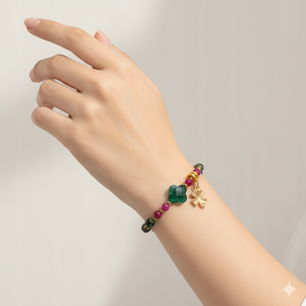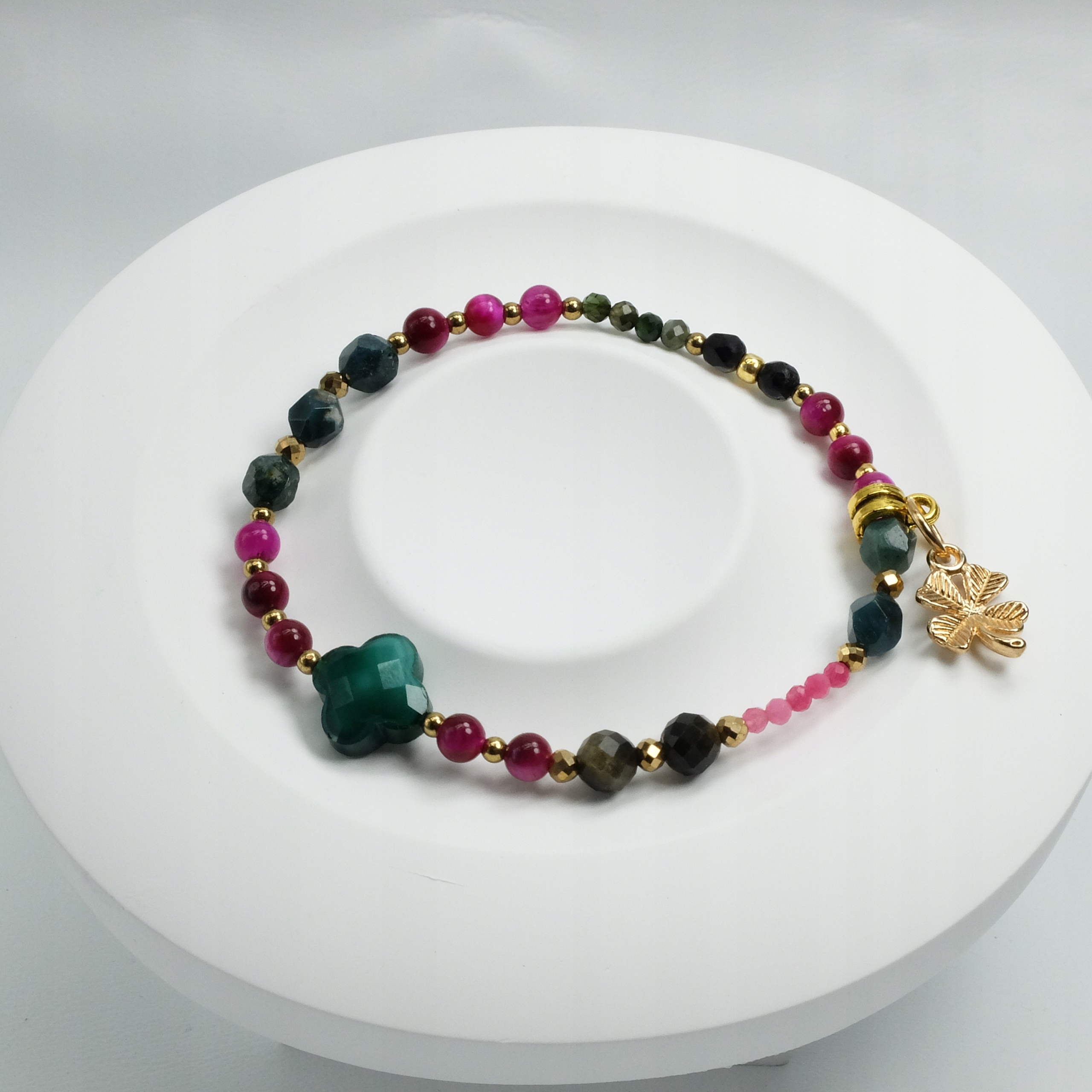 : Zamknij oczy i wyobraź sobie najbardziej bujny, kwitnący ogród. Ta bransoletka jest jego esencją. Soczysta zieleń, głęboka fuksja i szlachetne złoto przeplatają się, tworząc kompozycję pełną życia i radości. Zwieńczona zawieszką w kształcie koniczynki, staje się osobistym amuletem, który przyciąga szczęście i przypomina o pięknie, które rodzi się z natury.
