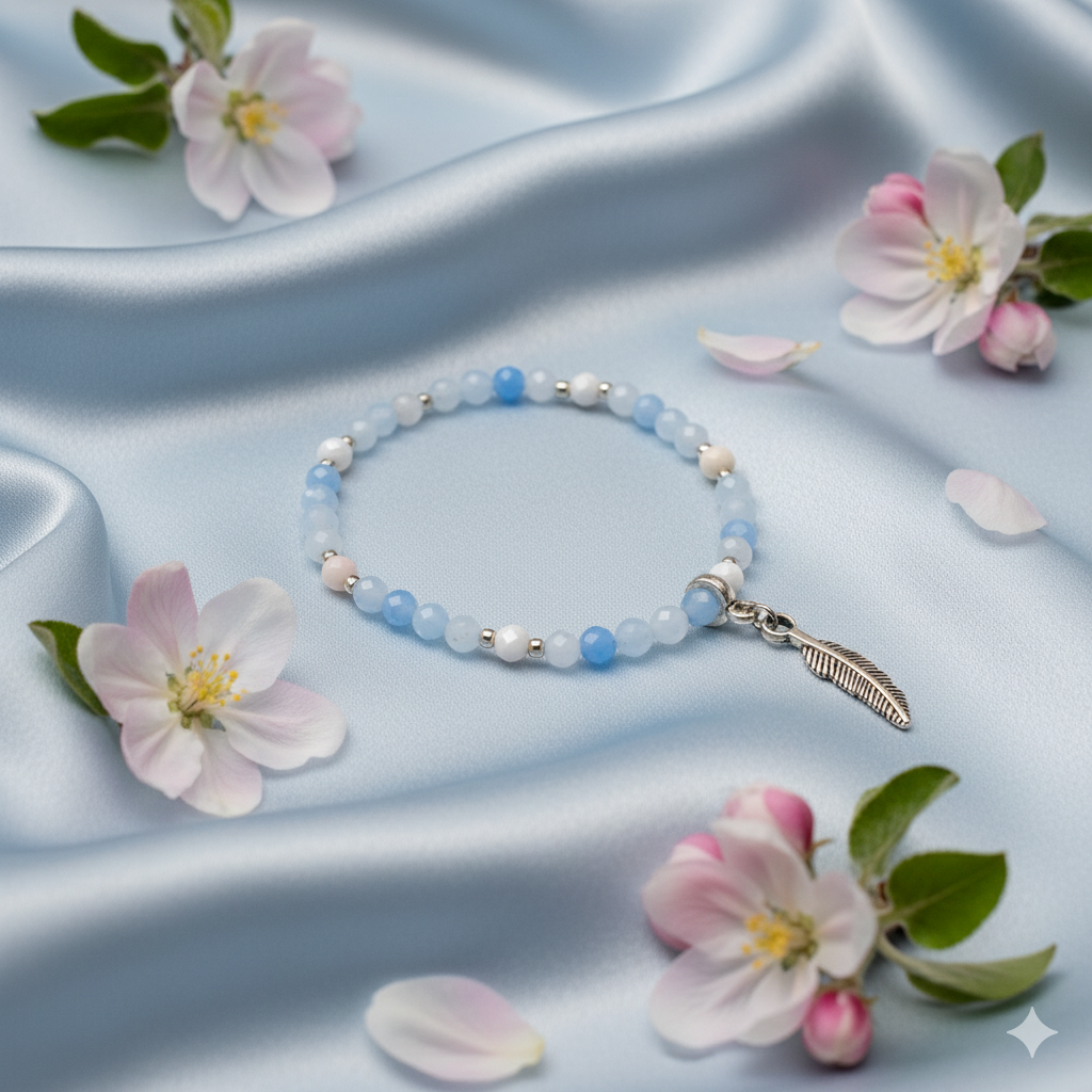 Lekka jak piórko, subtelna jak dotyk nieba. Kompozycja chłodnych błękitów akwamarynu i mlecznej bieli kamienia księżycowego tworzy aurę spokoju i harmonii. Srebrne piórko jest symbolem wolności, intuicji i duchowej podróży. To biżuteria dla wolnego ducha, która przypomina o lekkości bytu i pięknie prostoty.